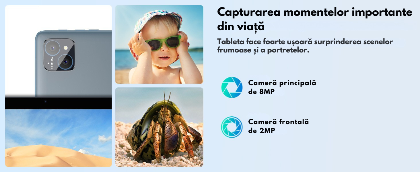 Captureaza momentele speciale cu ajutorul camerei din spate de 8MP, perfecta pentru fotografii clare si detaliate. Camera frontala de 2MP este ideala pentru apeluri video pe Zoom, Google Meet, Skype si pentru realizarea selfie-urilor de calitate.
