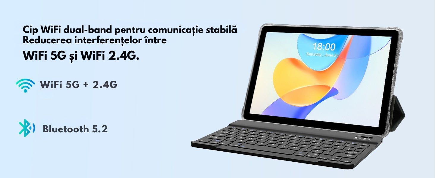Pentru o conexiune stabila si rapida, tableta este echipata cu WiFi Dual-Band (5G + 2.4G), reducand interferentele si imbunatatind experienta de navigare online si streaming. De asemenea, tehnologia Bluetooth 5.2 permite conectarea rapida a accesoriilor, precum casti wireless, boxe, tastaturi si mouse-uri Bluetooth.