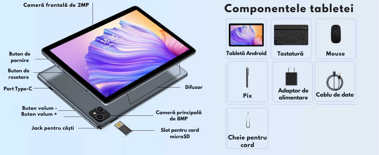 Tableta vine cu o tastatura detasabila si un mouse, transformand dispozitivul intr-un laptop portabil ideal pentru lucru, studii, editare de documente si notite rapide.