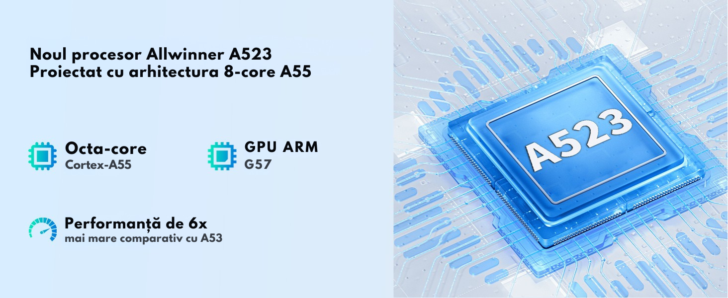 📱 Performanta excelenta cu procesor Octa-Core Allwinner A523