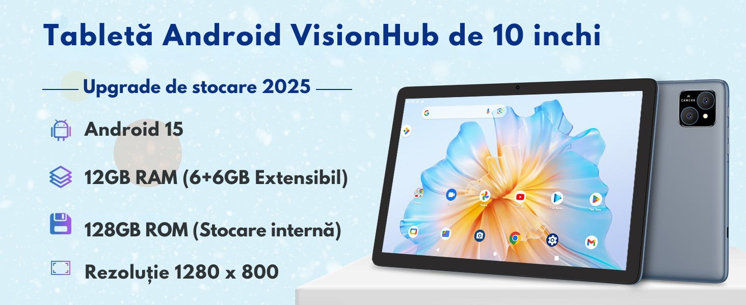 Tableta Android 15 VisionHub® 10.1 inch - 12GB RAM (6+6GB Extensibil), 128GB ROM, Octa-Core T606, 4G LTE + WiFi 5G, Camera Duala 8MP + 5MP, Baterie 8000mAh, Ecran IPS HD 1280x800, Bluetooth 5.0, GPS, USB-C