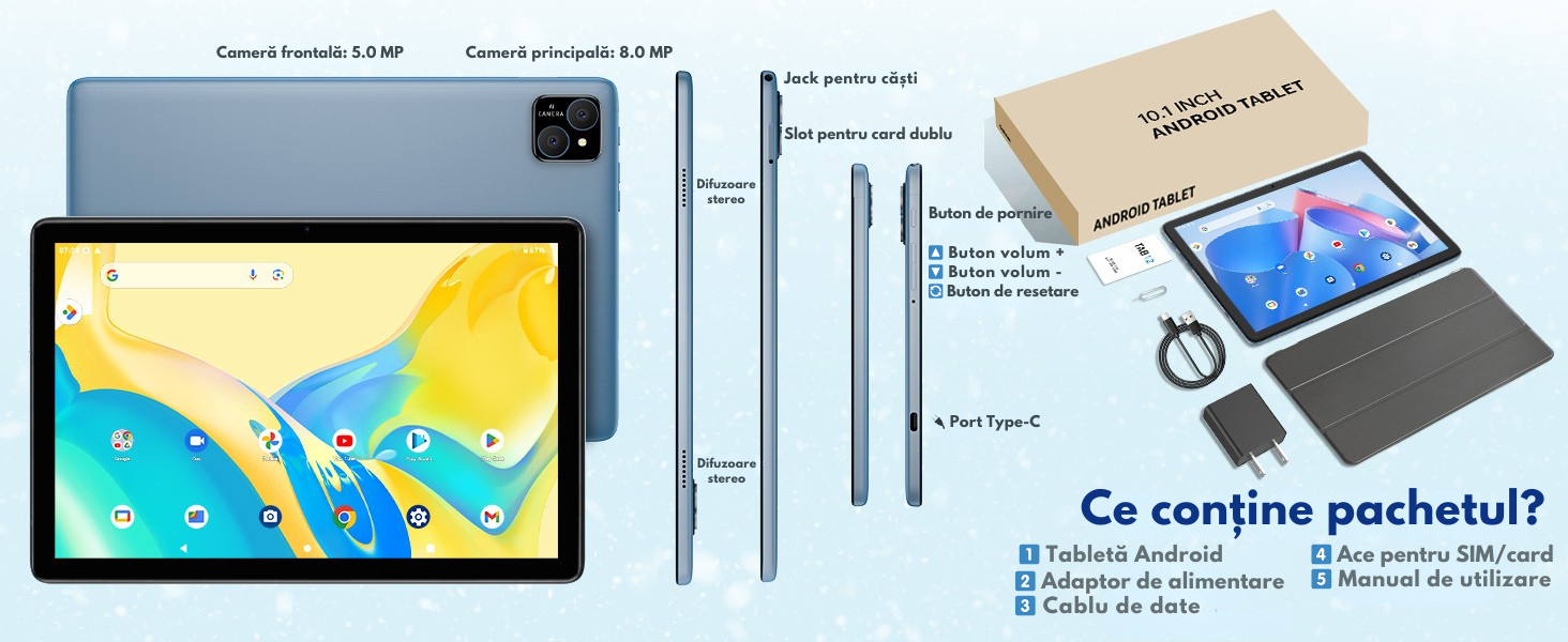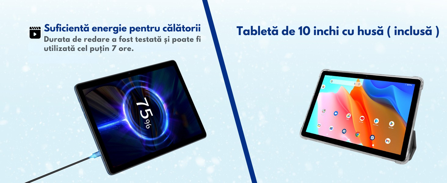 Tableta dispune de un ecran IPS HD de 10.1 inchi cu rezolutie 1280x800, oferind imagine clara, luminoasa si unghiuri largi de vizualizare. Indiferent daca urmaresti filme pe Netflix, YouTube, Disney+ sau citesti articole online, aceasta tableta cu ecran mare este alegerea perfecta.