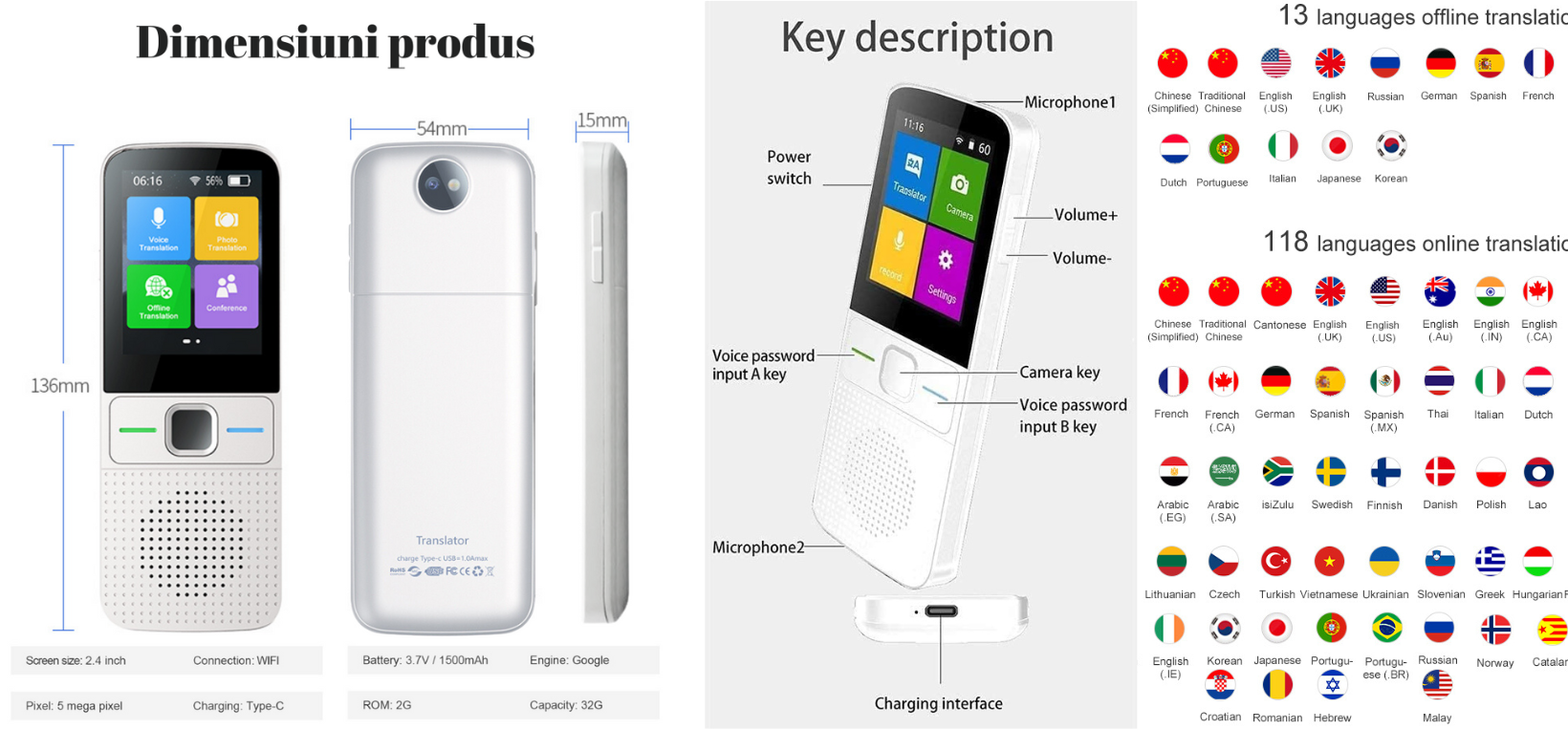 Acest translator vocal este creat special pentru a te ajuta sa comunici cu oricine, in orice context. Fie ca studiezi, muncesti sau calatoresti in strainatate, dispozitivul este gata sa traduca fiecare conversatie. E suficient sa pornesti translatorul si sa apesi pe un buton pentru a incepe traducerea.
