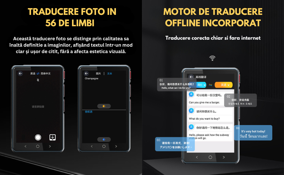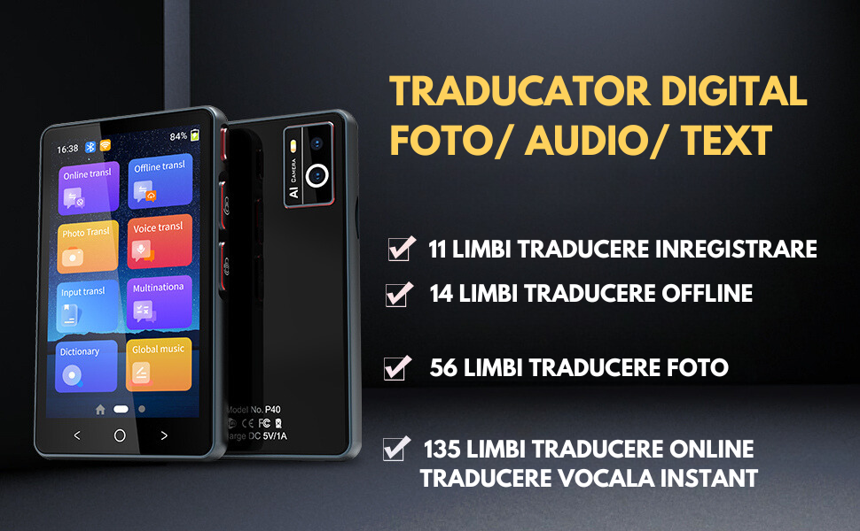Suport pentru 135 de limbi, oferindu-ți posibilitatea de a comunica cu persoane din intreaga lume. Traducere vocală instantanee in două direcții, perfect pentru negocieri sau dialoguri față in față.