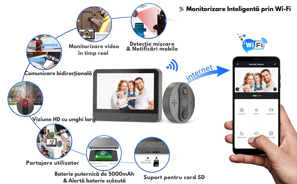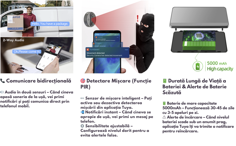 Instalare usoara si autonomie mare - Instalarea este simpla, iar dispozitivul include o baterie de 5000mAh, care ofera pana la 30 de zile de autonomie in standby. Dispune de notificari pentru baterie descarcata si suport pentru incarcare prin USB. Este necesar un vizor cu un diametru de 16mm-35mm pe usa; daca nu exista, trebuie realizat unul cu dimensiunea corespunzatoare. Asistenta tehnica disponibila daca este necesar. Daca notificarile aplicatiei intarzie, verifica daca reteaua WiFi de acasa nu este restrictionata.