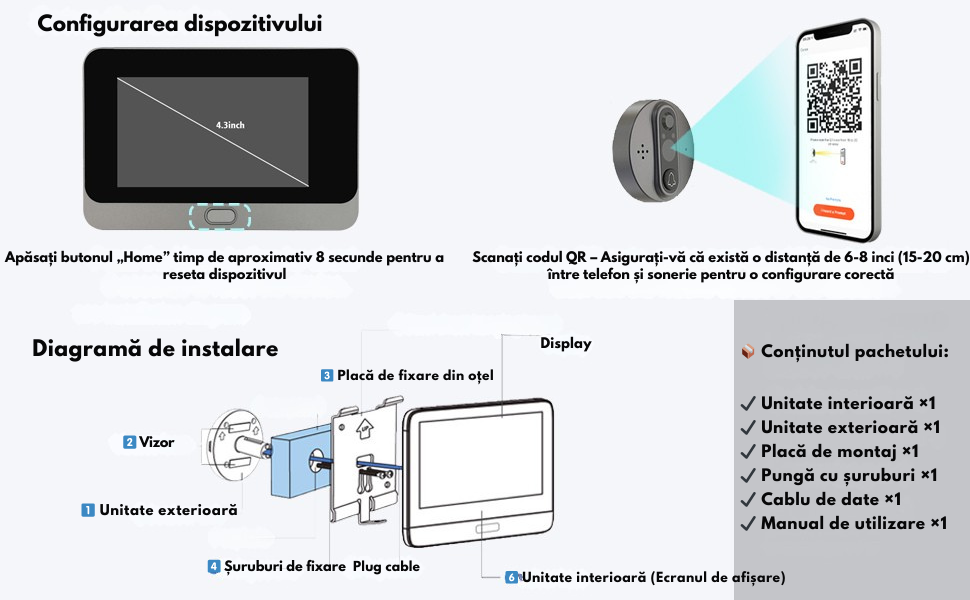 Alerte instantanee si monitorizare in timp real - Dispozitivul trimite alerte instantanee de detectare a miscarii direct pe telefonul mobil, permitandu-ti sa monitorizezi si sa raspunzi in timp real vizitatorilor sau eventualilor intrusi. Unitatile interioara si exterioara trebuie instalate pe usa sau pe perete, la o distanta de cel mult 12 cm, fiind conectate prin cabluri prin intermediul vizorului.