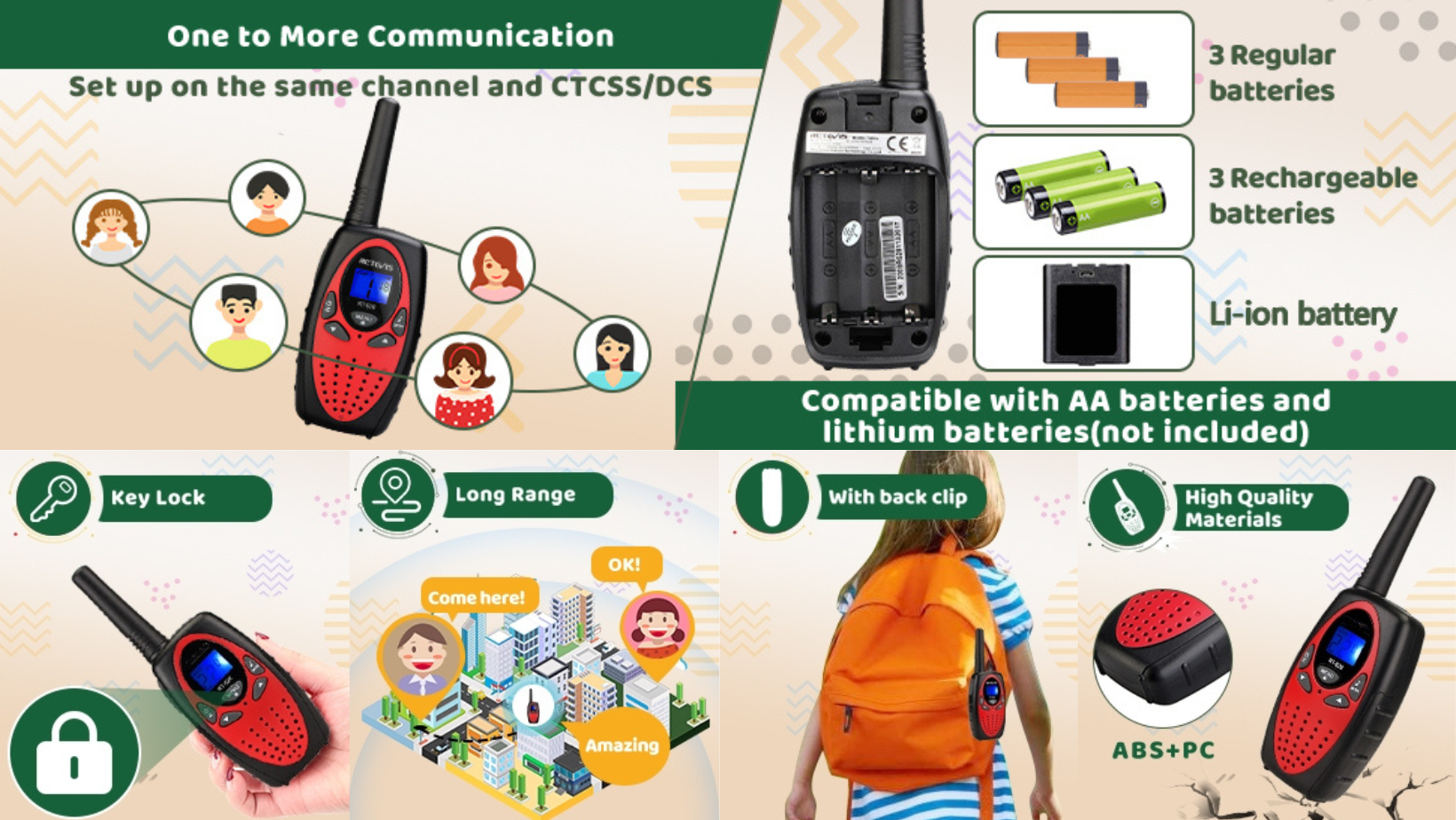 Design prietenos: dimensiunea palmei, usor (2,9 oz), functie hands-free (VOX), blocare a tastelor (blocare a canalului), putere si volum reglabile, ecran LCD cu iluminare din spate, clip de curea cu orificiu pentru panglica, mufa pentru casti de 2,5 mm cu capac pentru praf, materiale durabile si ecologice (ABS). Toate walkie talkie-urile pentru copii si adulti au obtinut cea mai recenta certificare FCC.